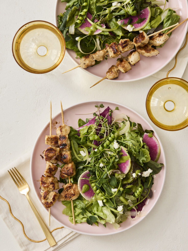 5. Transfer grilled chicken skewers to plate to rest while you assemble the salad.