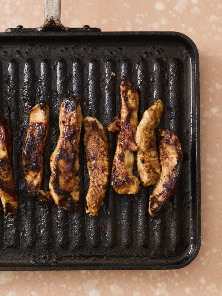 2. On a grill pan or sauté pan, heat oil over medium heat until shimmering. With tongs, remove the chicken from the marinade and place directly onto pan in one layer. If the pan isn’t large enough, make in batches. Season with salt and pepper.