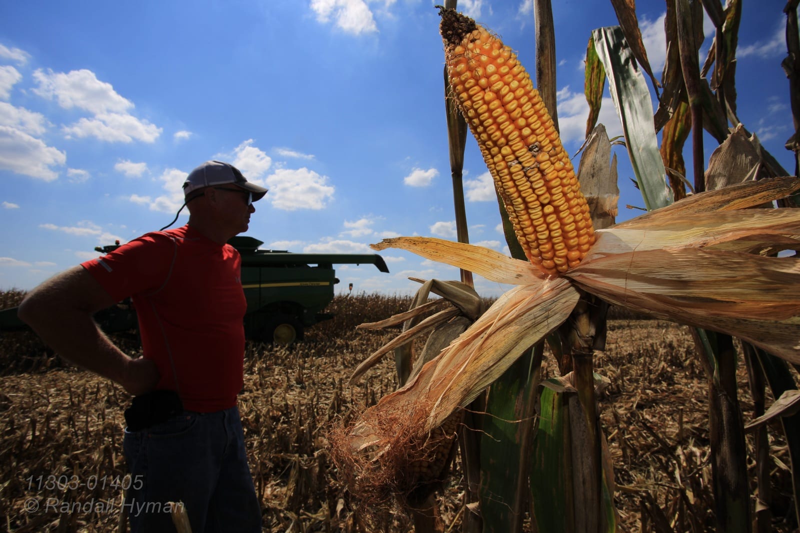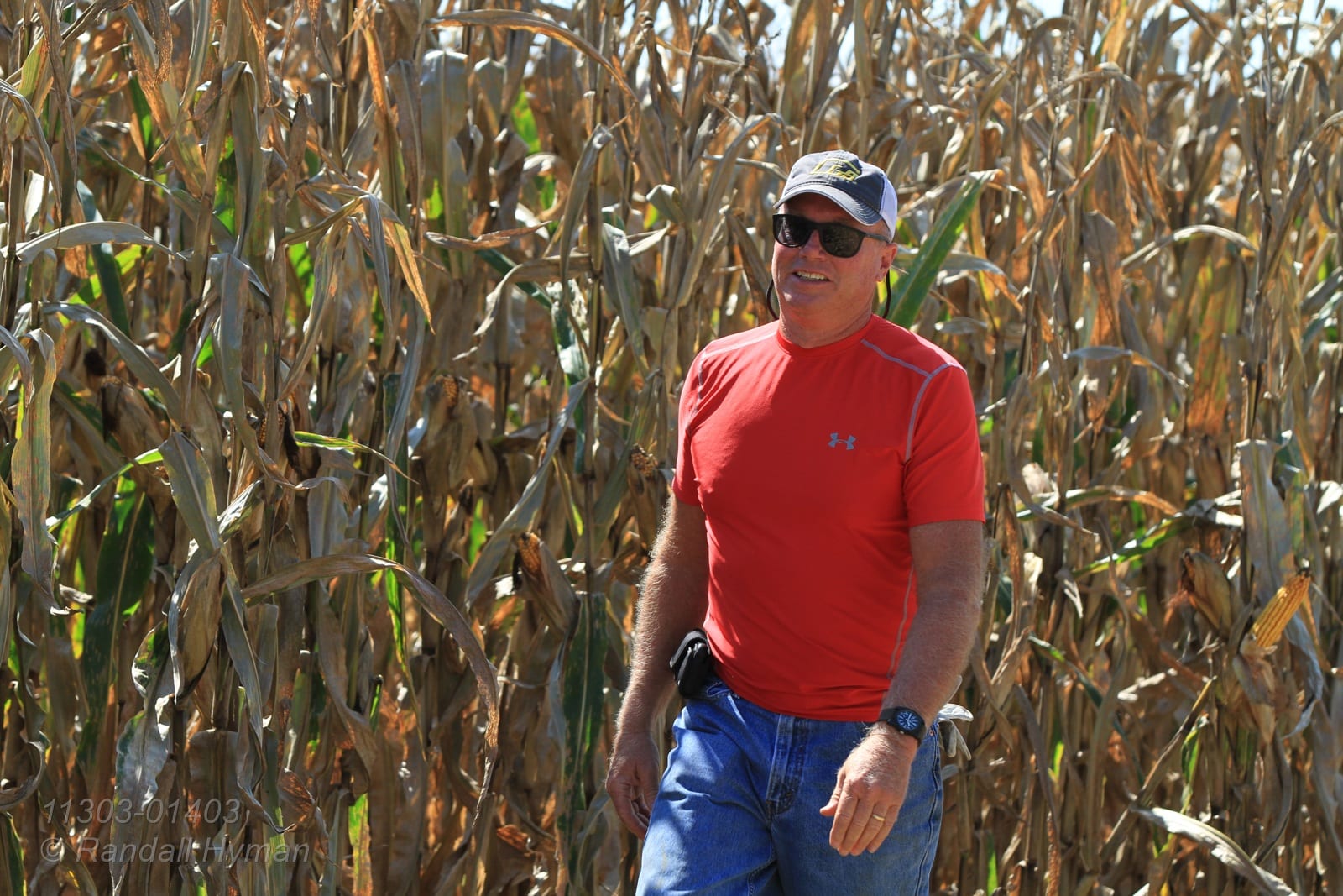 - Dick Gillen walks through harvest-ready cornfield on Reeder farm near Monmouth, Illinois.