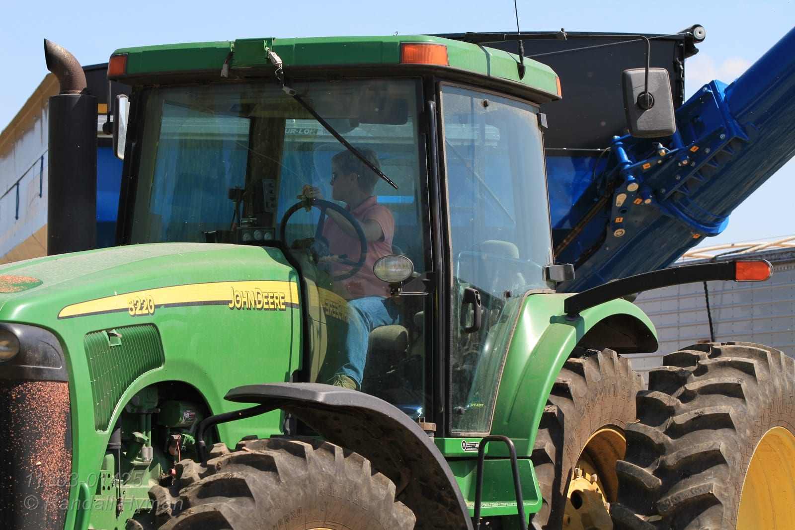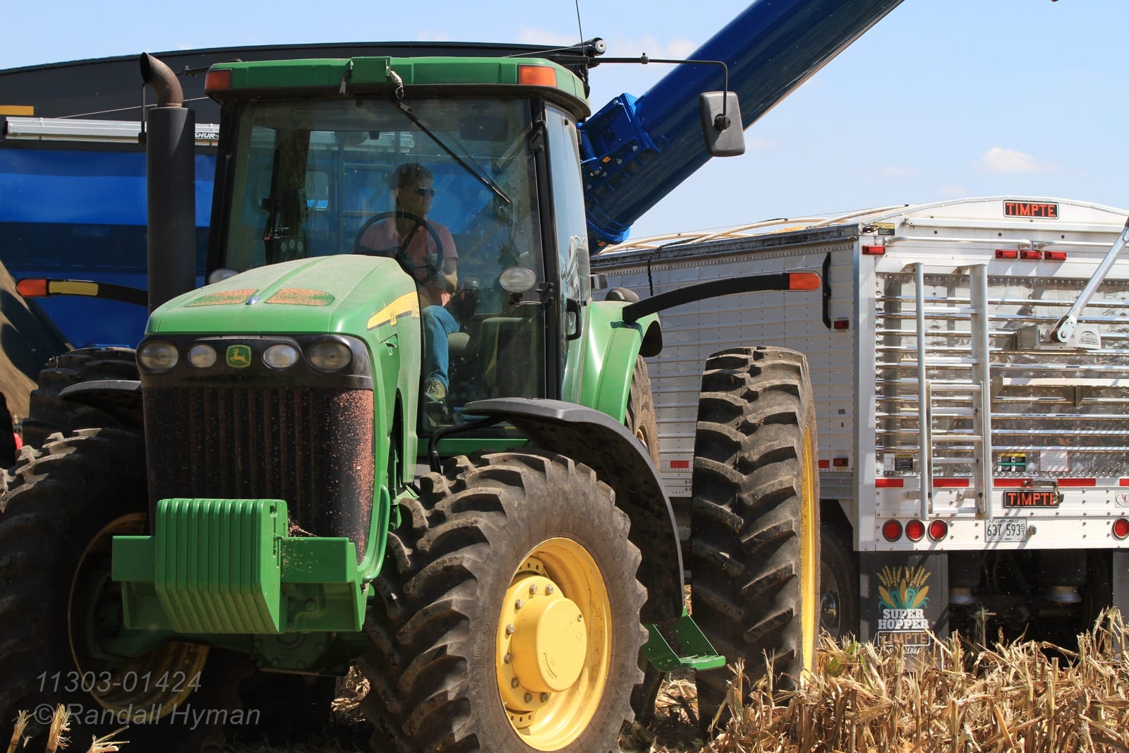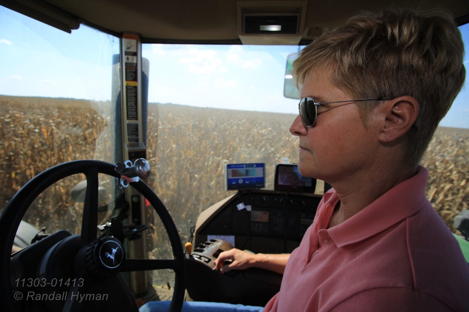 - Janet Gillen in tractor cab pulls auger wagon during corn harvest; Monmouth, Illinois.