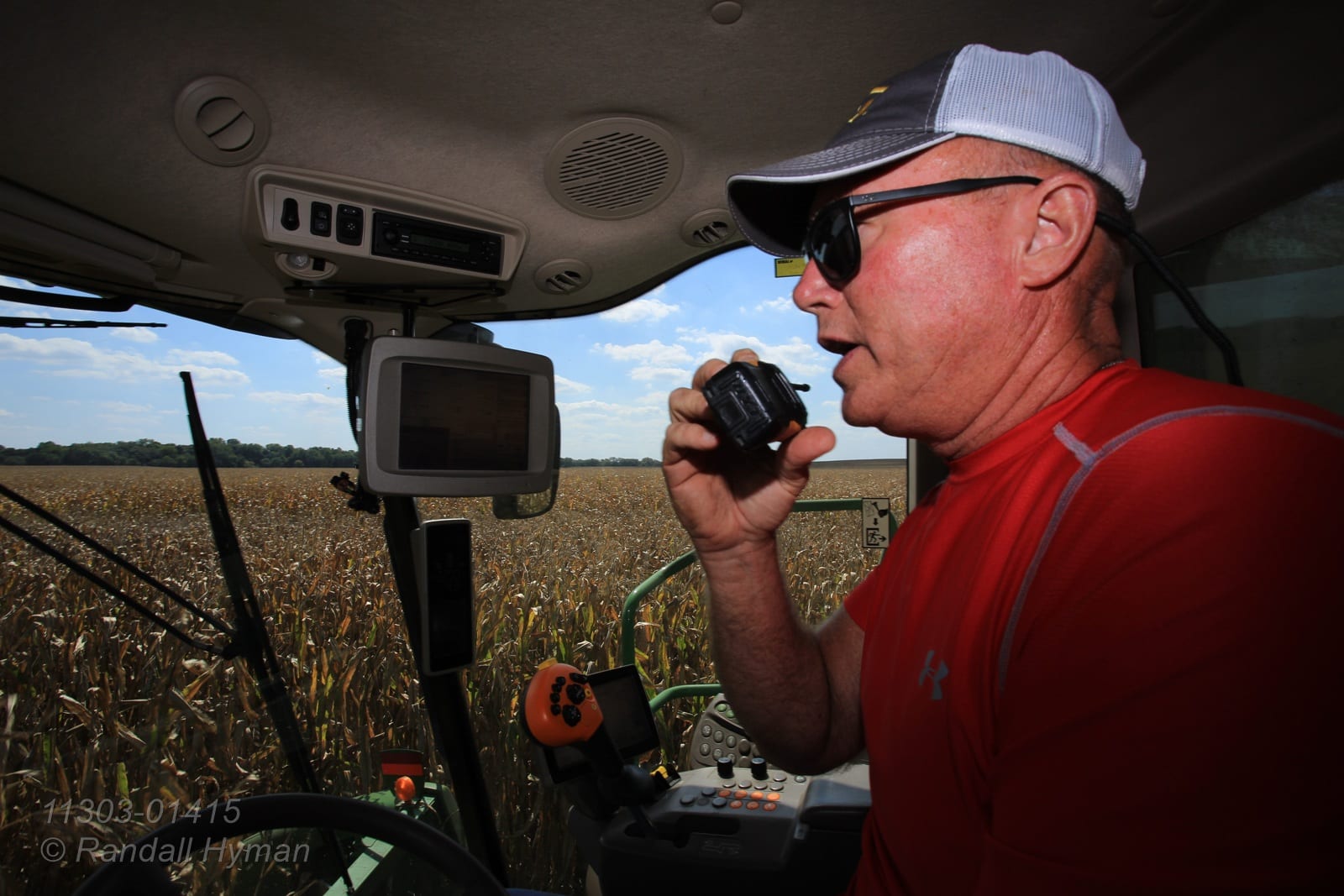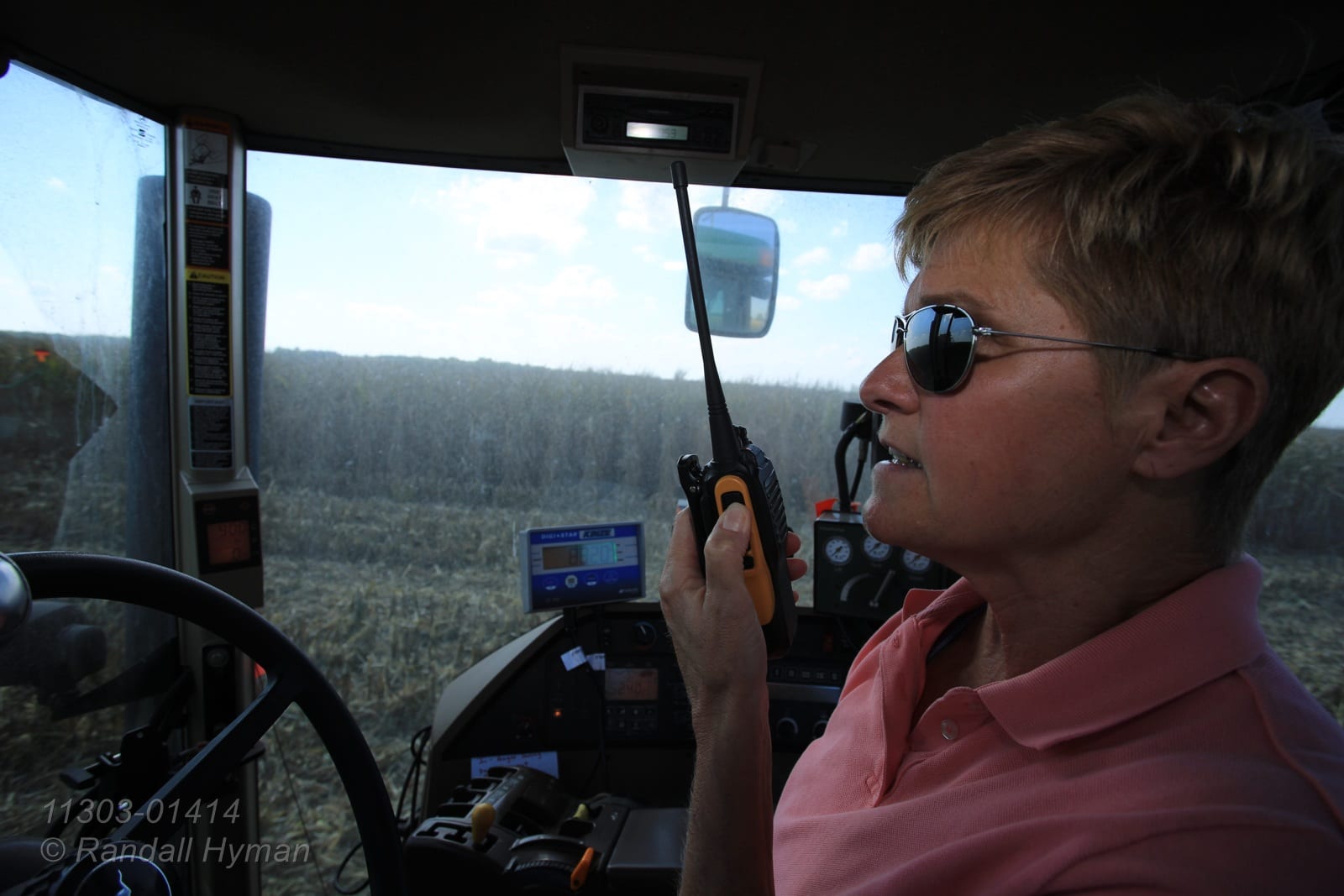 - Dick Gillen talks to wife Janet on walkie talkie from cab of combine as they work together during corn harvest; Monmouth, Illinois.