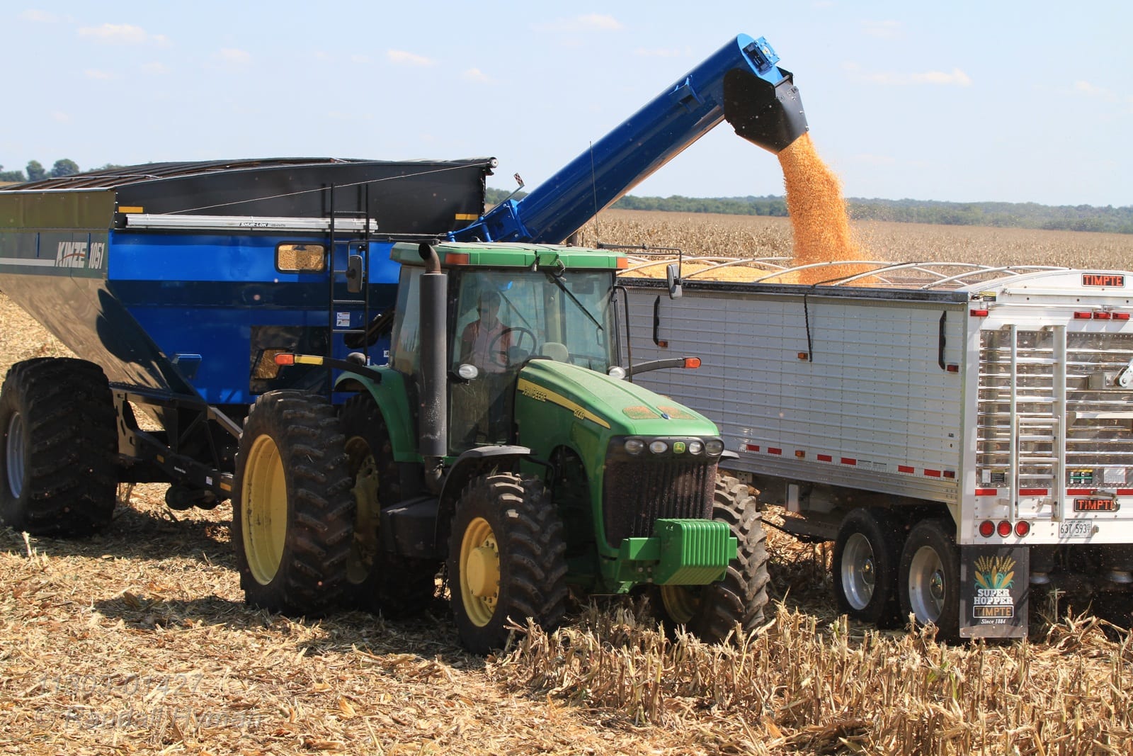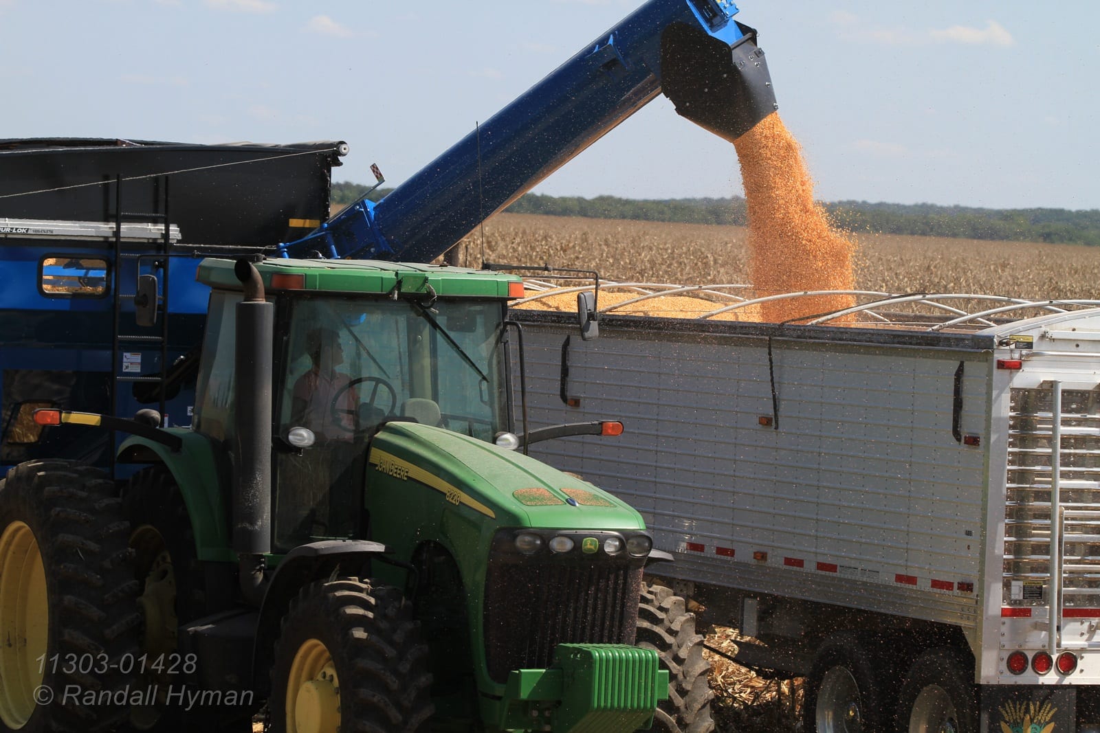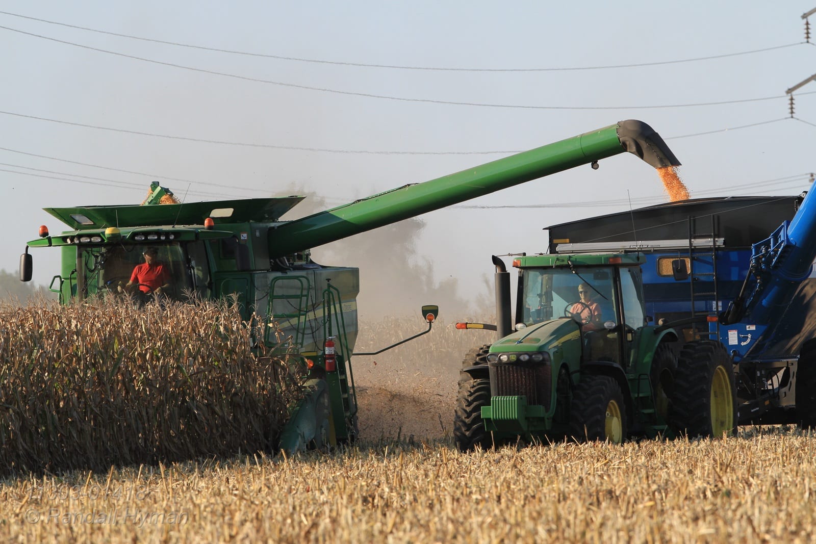 - Janet Gillen drives tractor pulling auger wagon beside husband, Dick, who transfers harvested corn to her as he combines cornfield on her farm near Monmouth, Illinois.