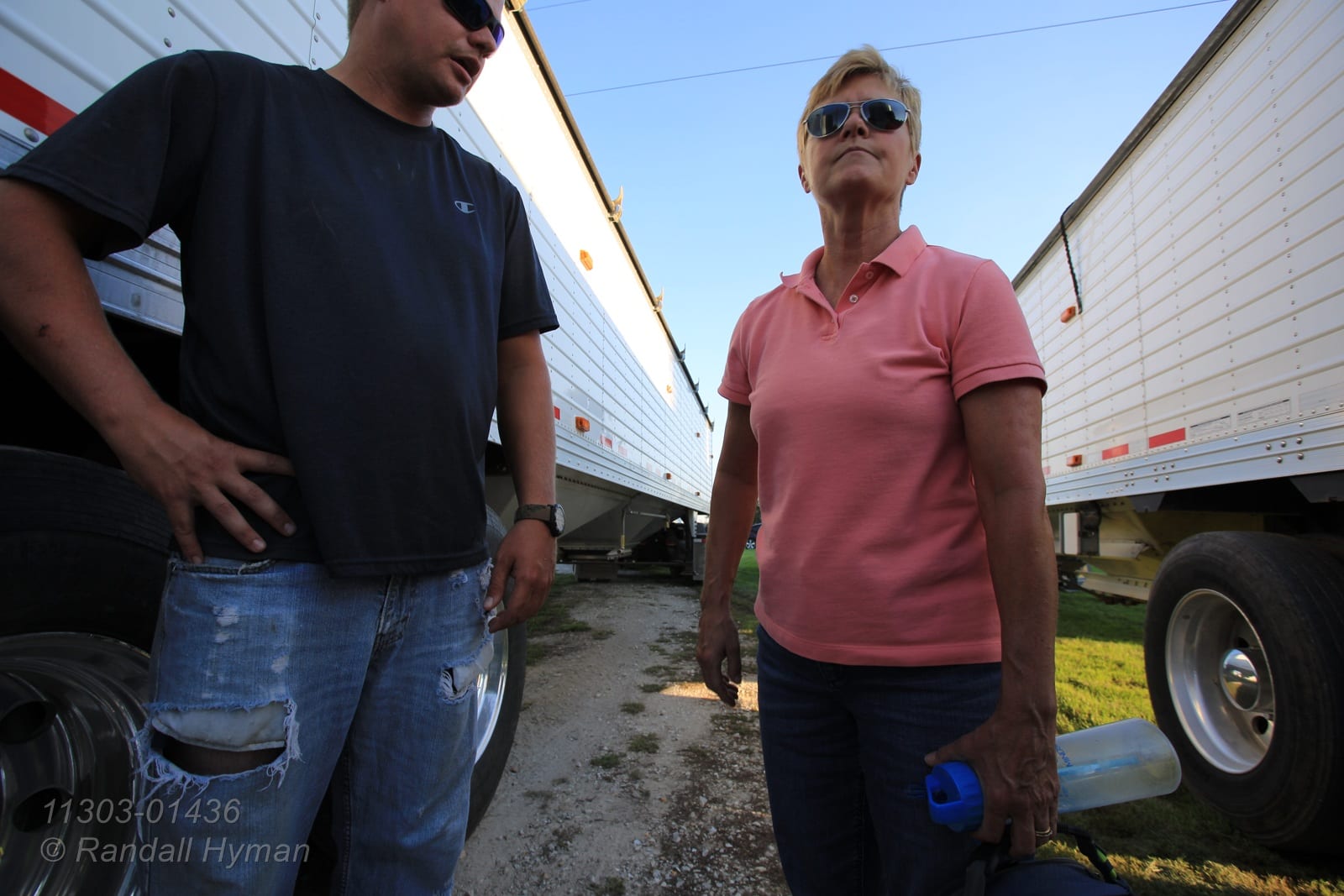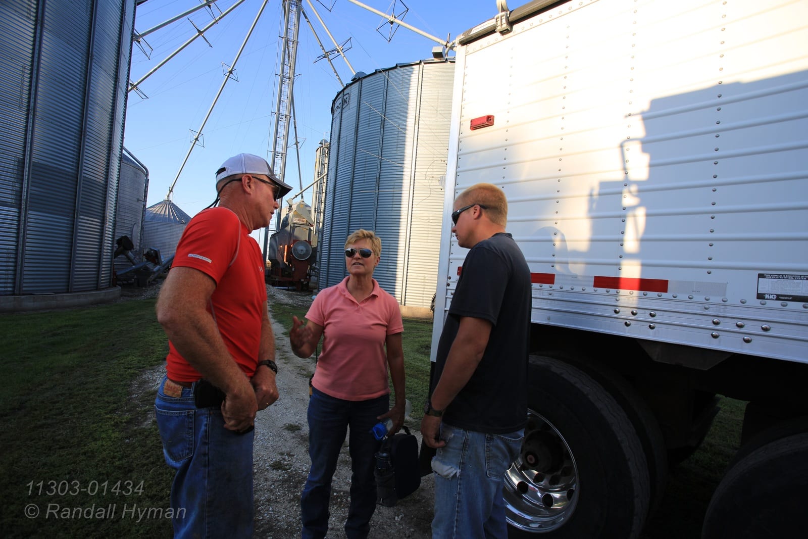 - Janet Reeder Gillen confers with husband Dick Gillen and her son Devin Reeder at grain bin complex during harvest on Reeder farm near Monmouth, Illinois.