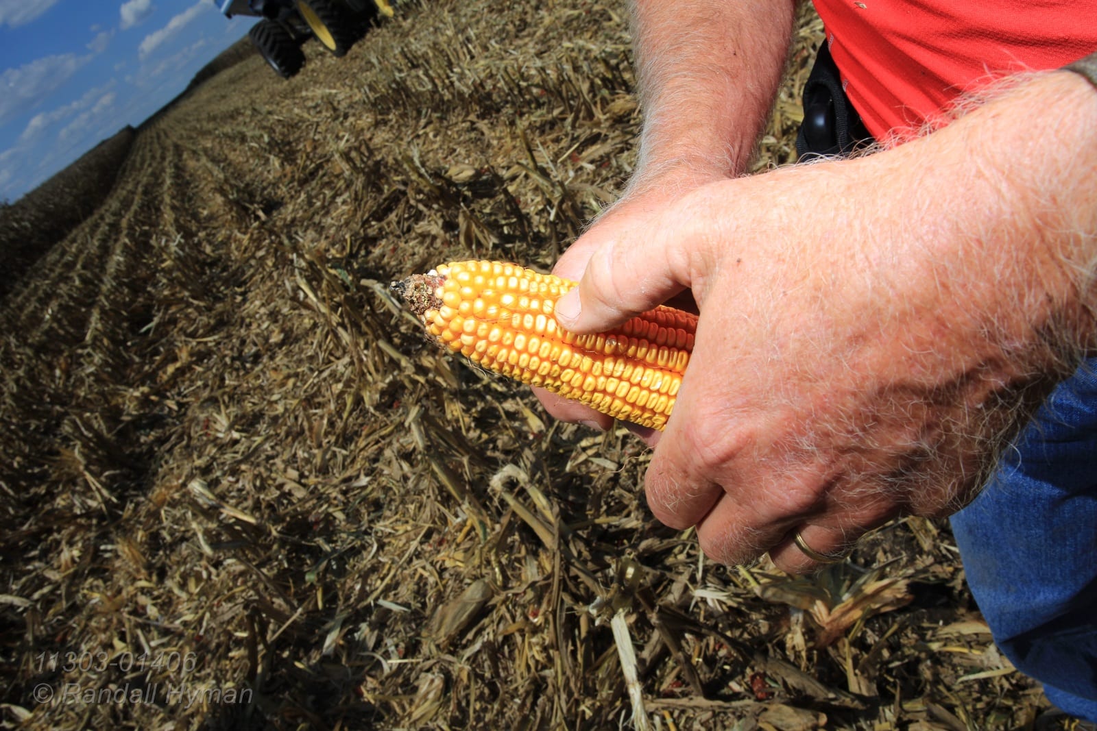 - Dick Gillen examines ear of corn during harvest near Monmouth, Illinois.