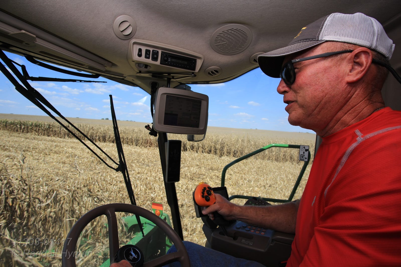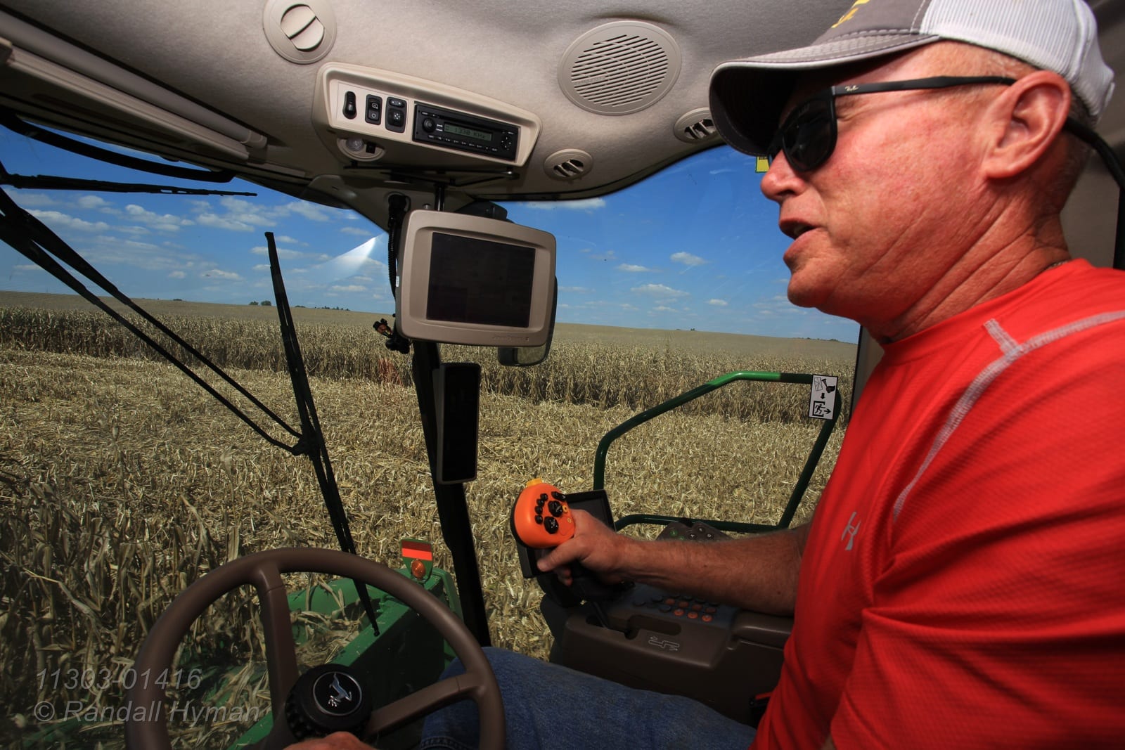 - Dick Gillen in cab of combine during corn harvest; Monmouth, Illinois.