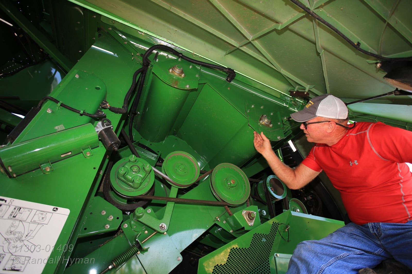 - Dick Gillen inspects combine during harvest; Monmouth, Illinois.