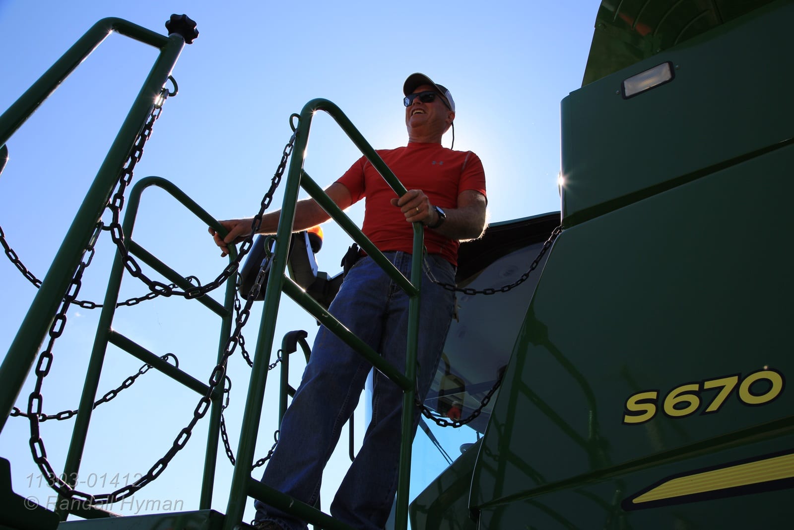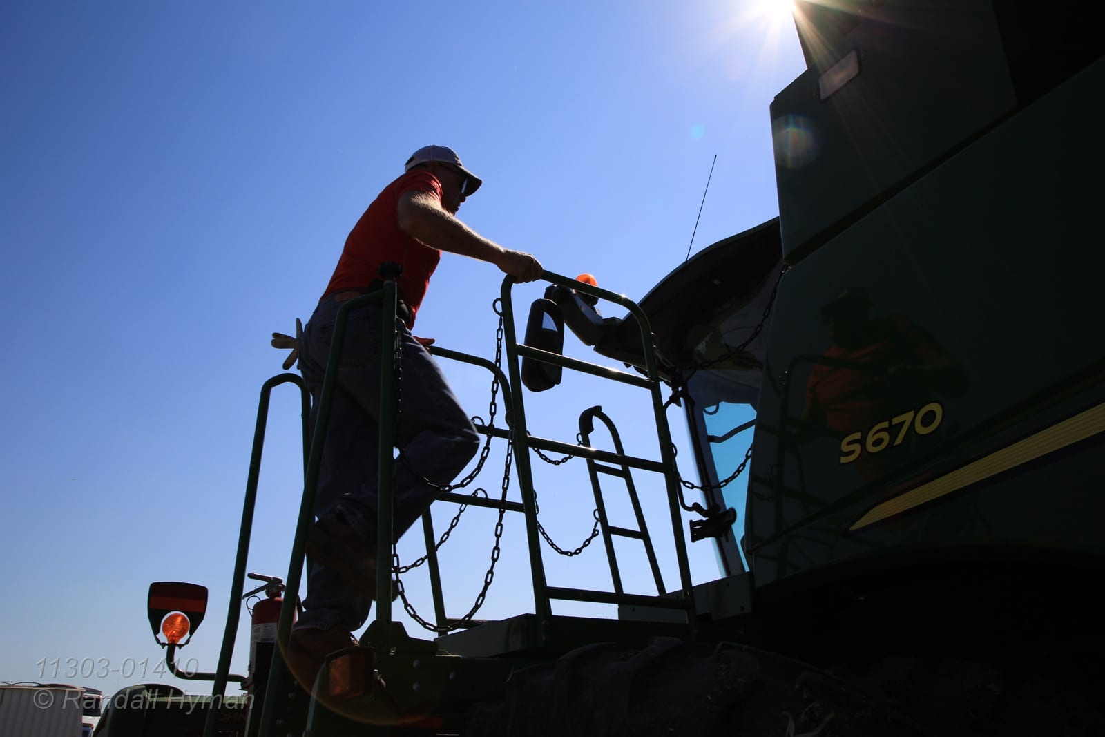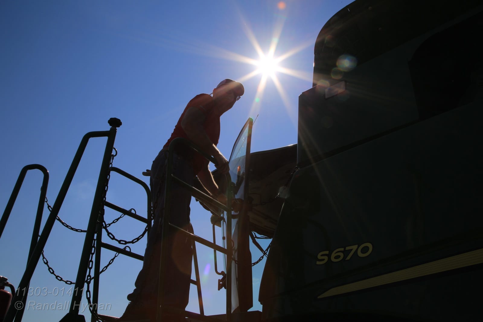 - Dick Gillen mounts combine during harvest; Monmouth, Illinois.