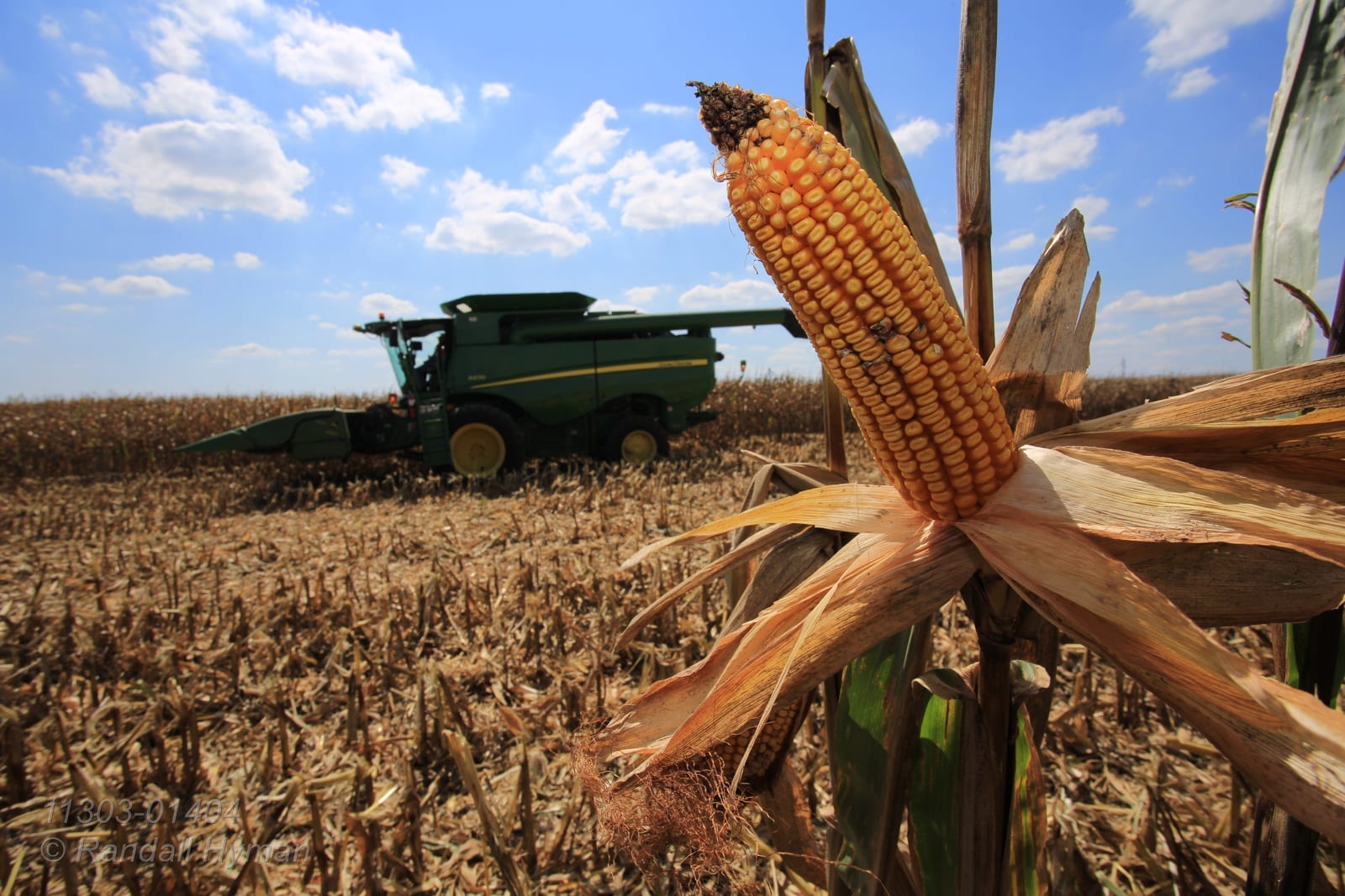 - Ear of corn on stalk during harvest on Reeder farm near Monmouth, Illinois.