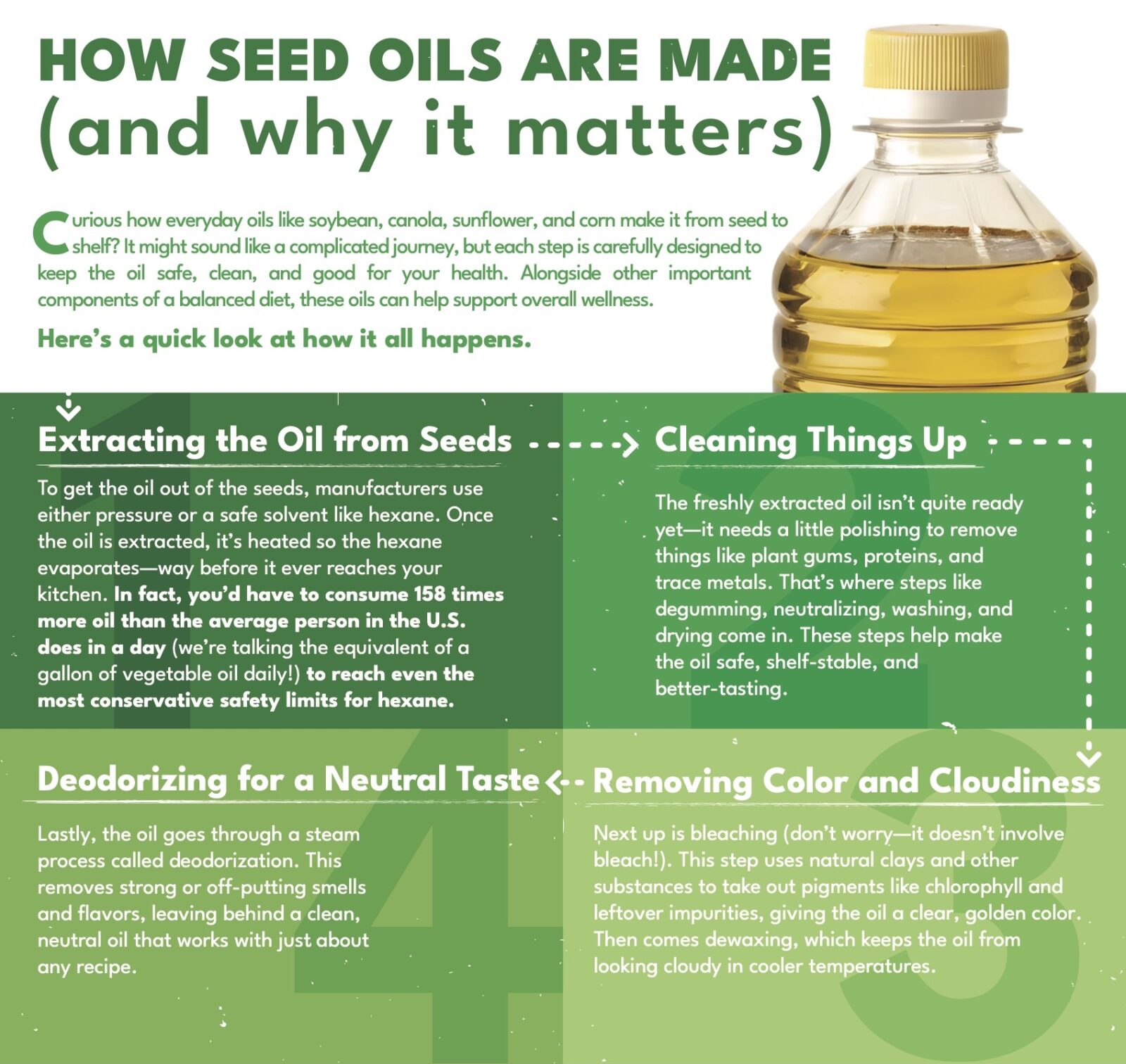 Most seed oils are processed to make sure they’re safe, healthy, and affordable. Some ways to make seed oils involve using food-grade solvents like hexane (an organic compound) to efficiently extract the oils from the seeds. Hexane is meticulously removed post-use, resulting in pure, crude seed oil. As a final step, seed oils are deodorized to eliminate any unwanted colors, odors, or other environmental contaminants. Even after processing, seed oils are a good source of beneficial nutrients like vitamin E.
