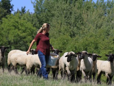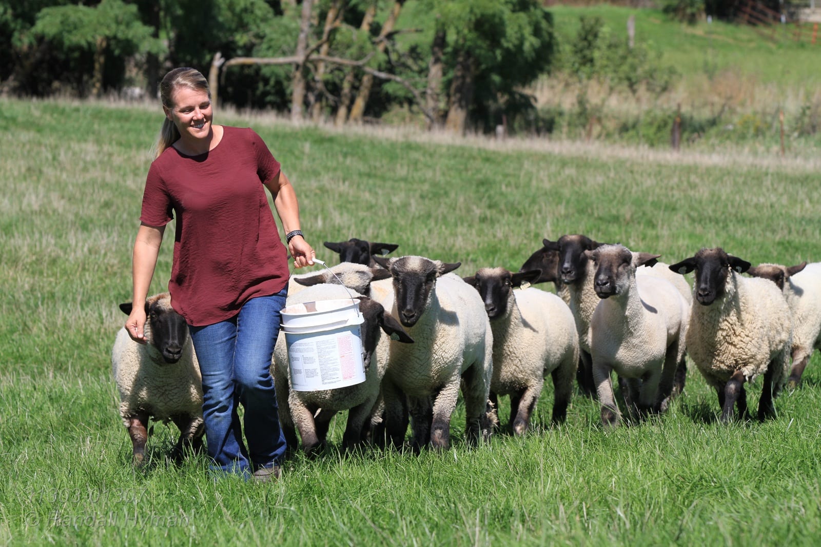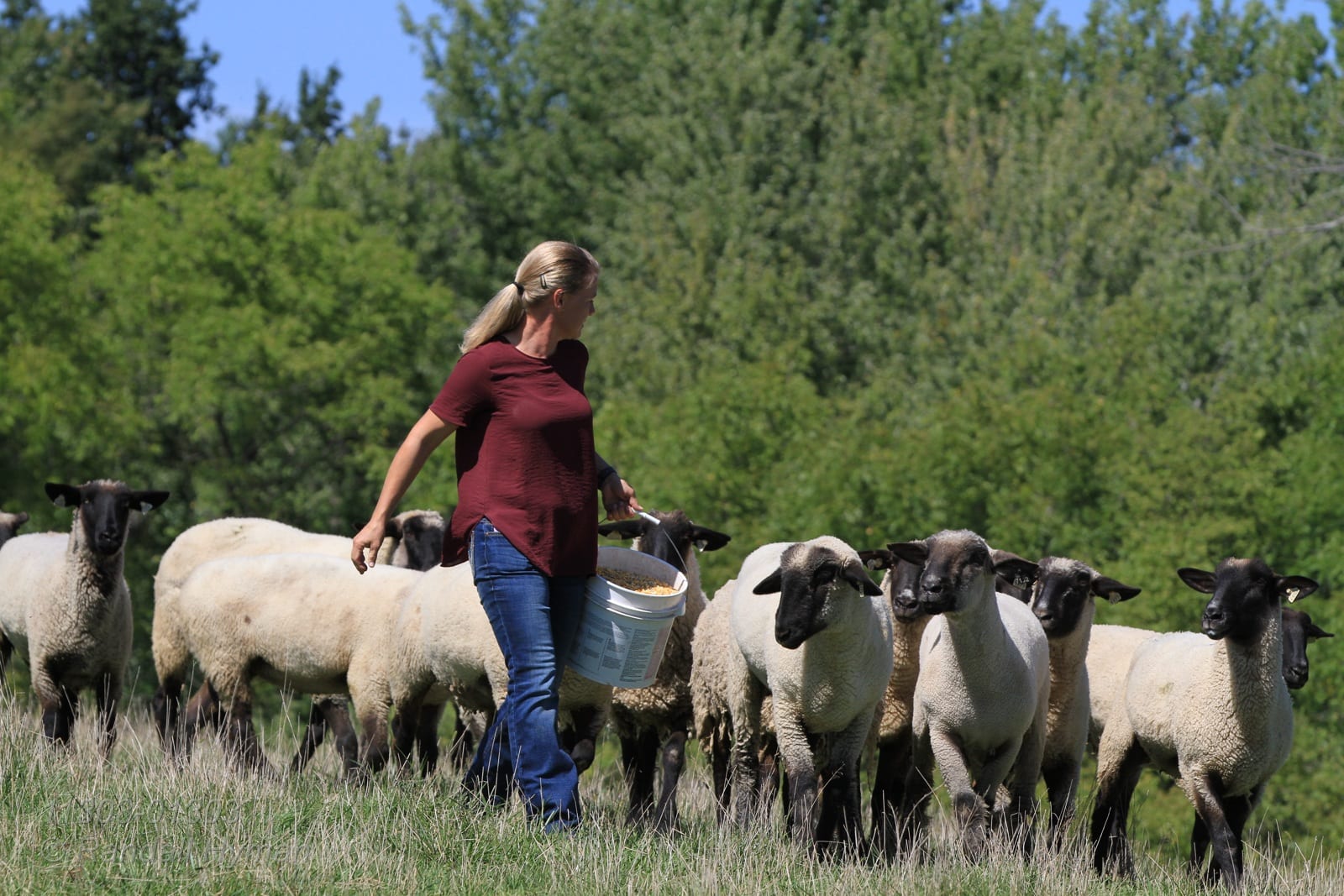 - Robin Corzatt feeds prize show sheep in pasture on her farm near Berwick, Illinois.
