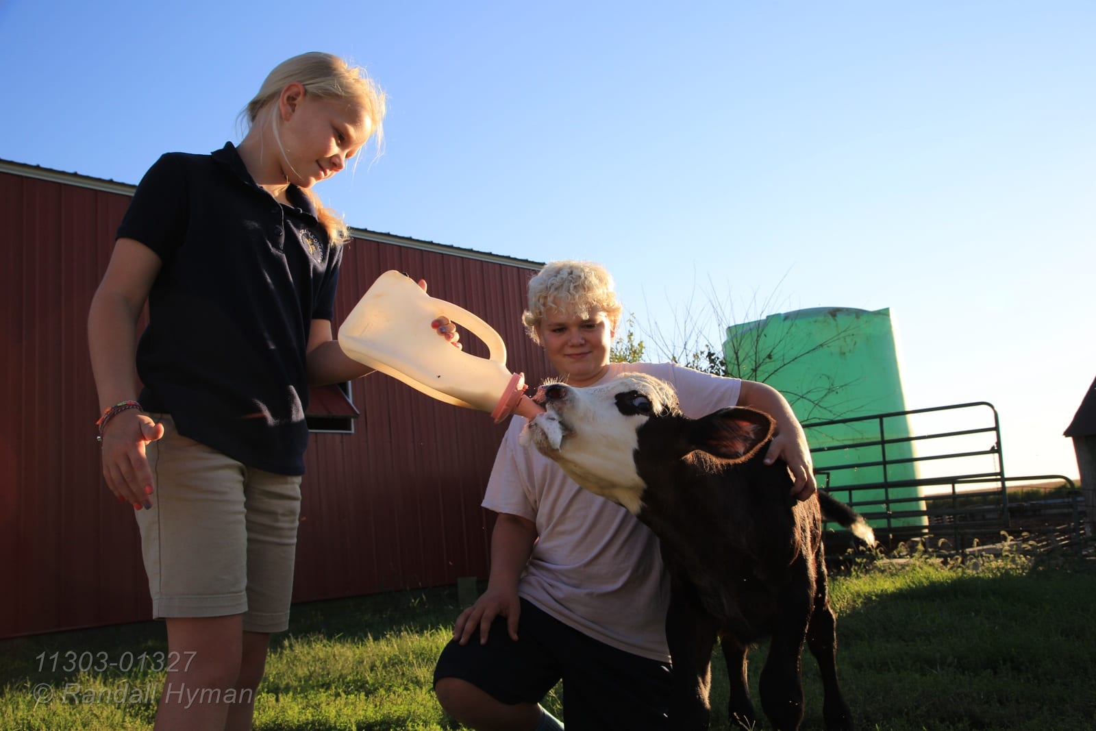 - Mallory Corzatt (age 9) and her brother Logan (age 12) bottle feed young calf at family farm near Berwick, Illinois.