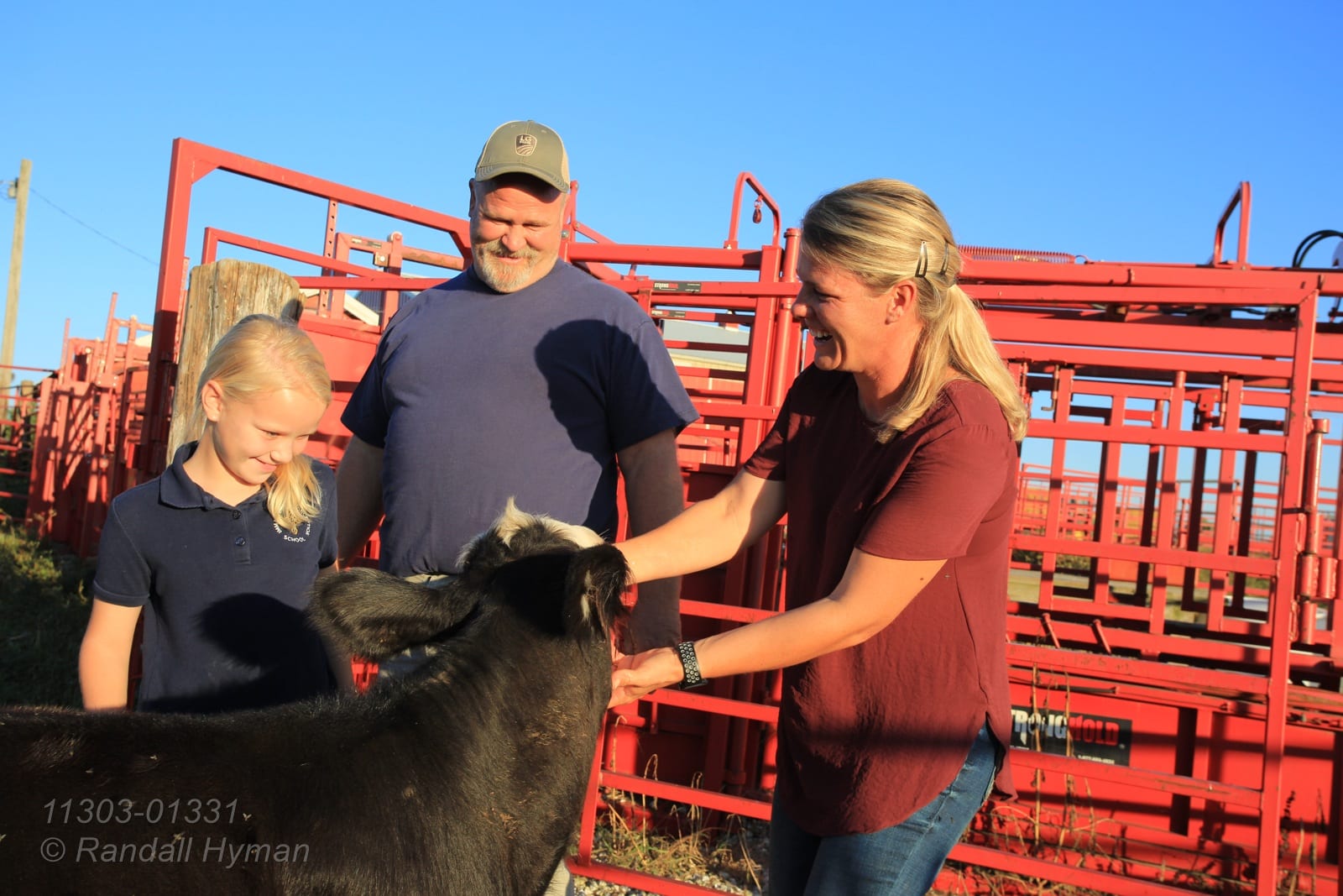 - Brad, Robin and daughter Mallory Corzatt admire young calf in barnyard on their farm near Berwick, Illinois.