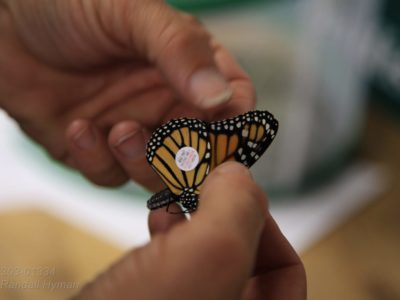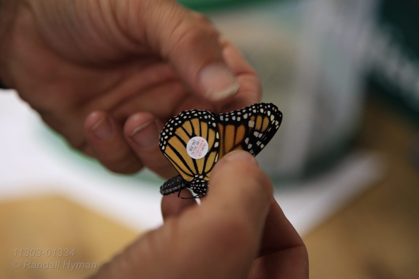 - Robin Corzatt tags newly-emerged monarch butterfly on her farm near Berwick, Illinois.