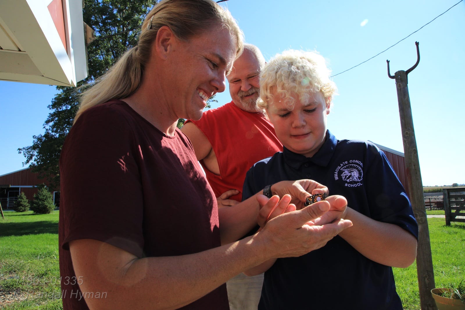 - Robin Corzatt and son Logan (age 12) release newly-tagged monarch butterfly on their farm as father Brad looks on; Berwick, Illinois.