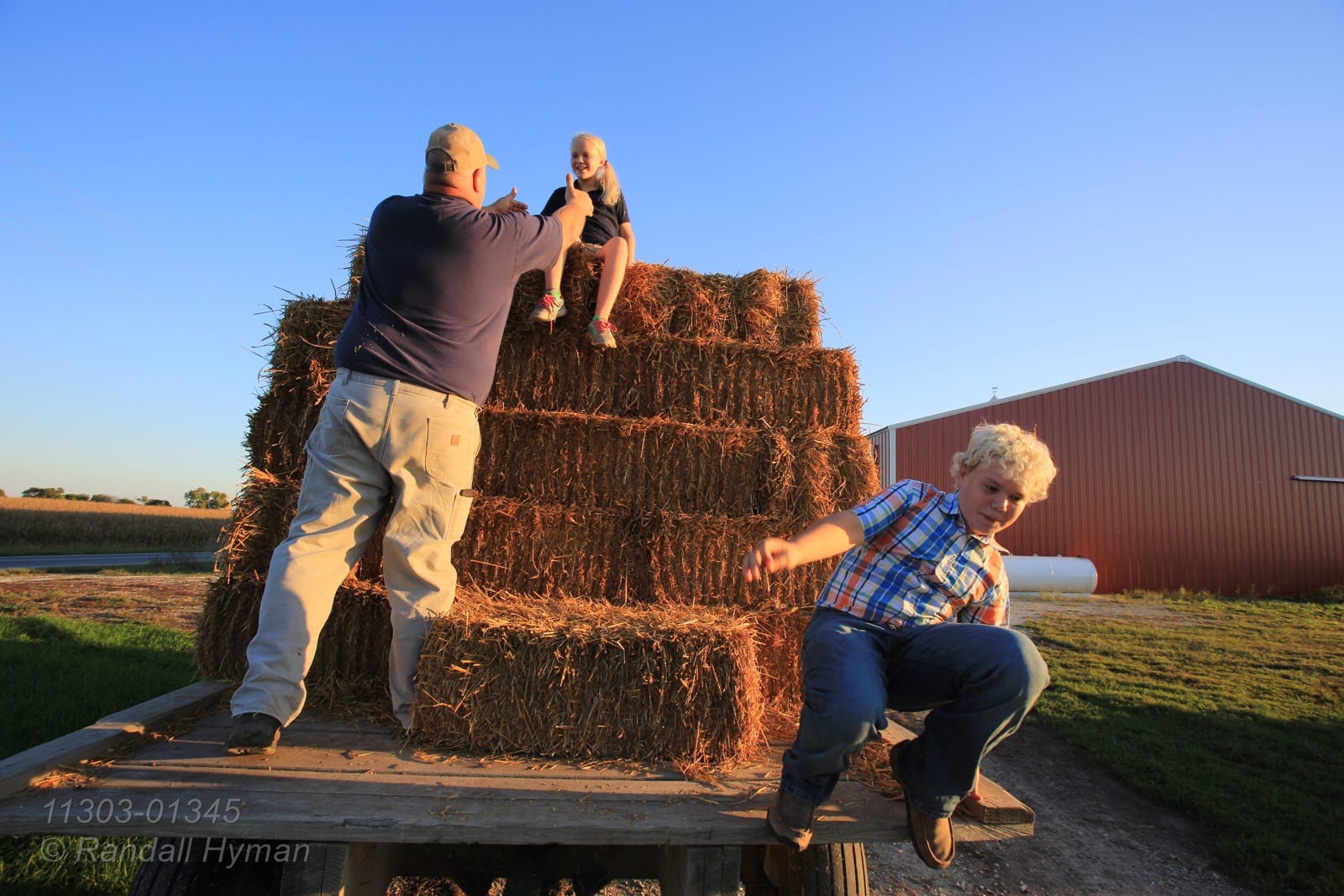 - Brad Corzatt helps daughter Mallory off top of hay wagon while her brother Logan jumps down on their farm; Berwick, Illinois.
