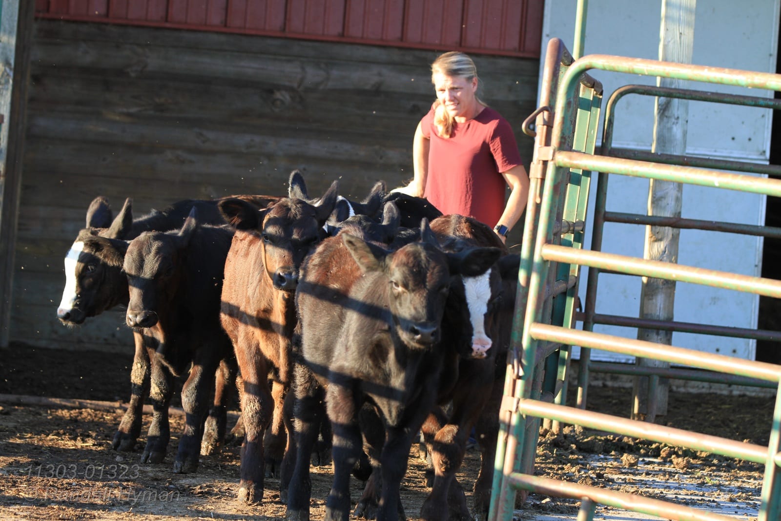 - Robin Corzatt herds young calves on her farm near Berwick, Illinois.