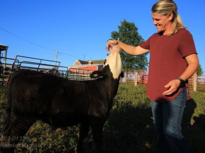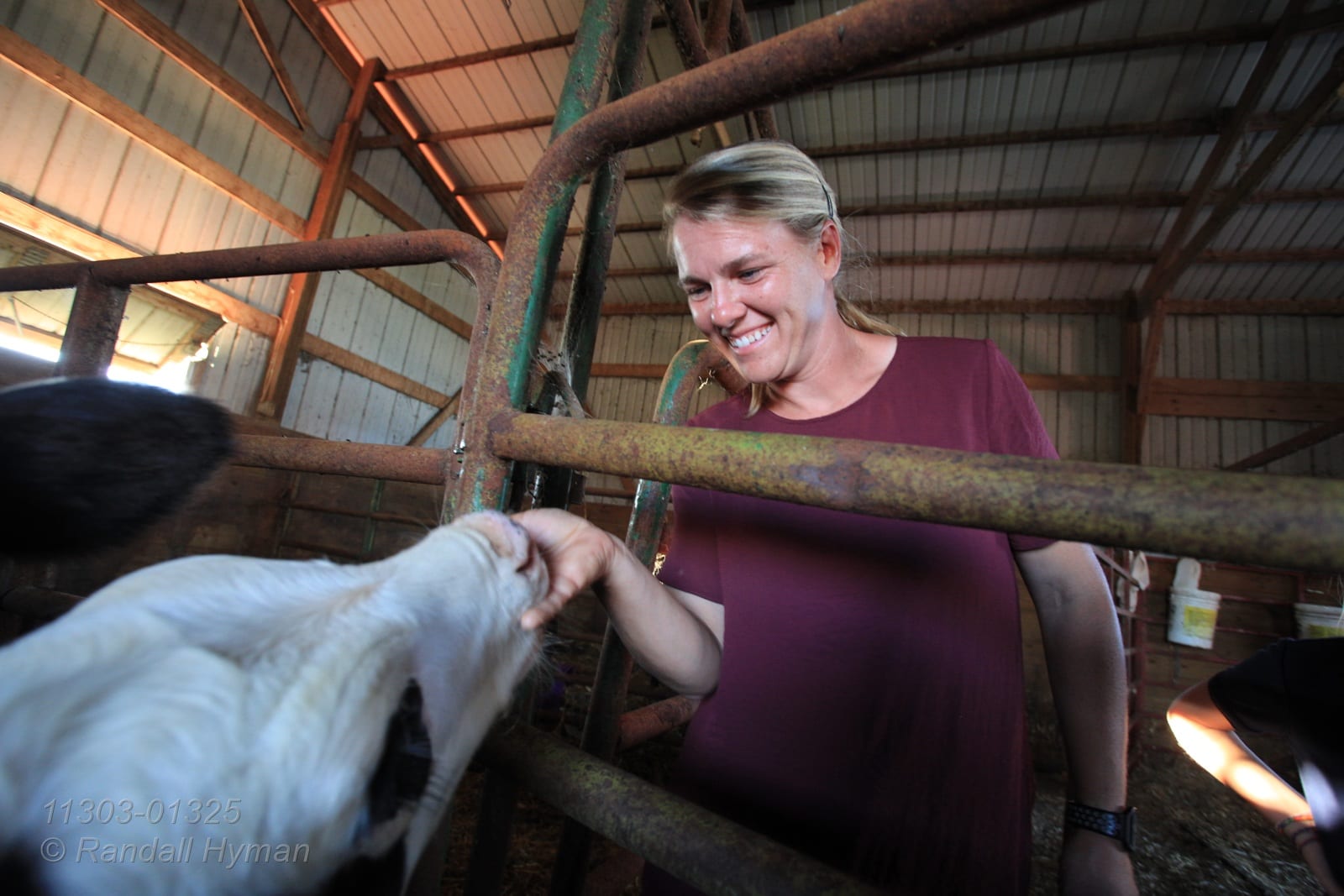 - Robin Corzatt plays with young calf in barnyard on her farm near Berwick, Illinois.