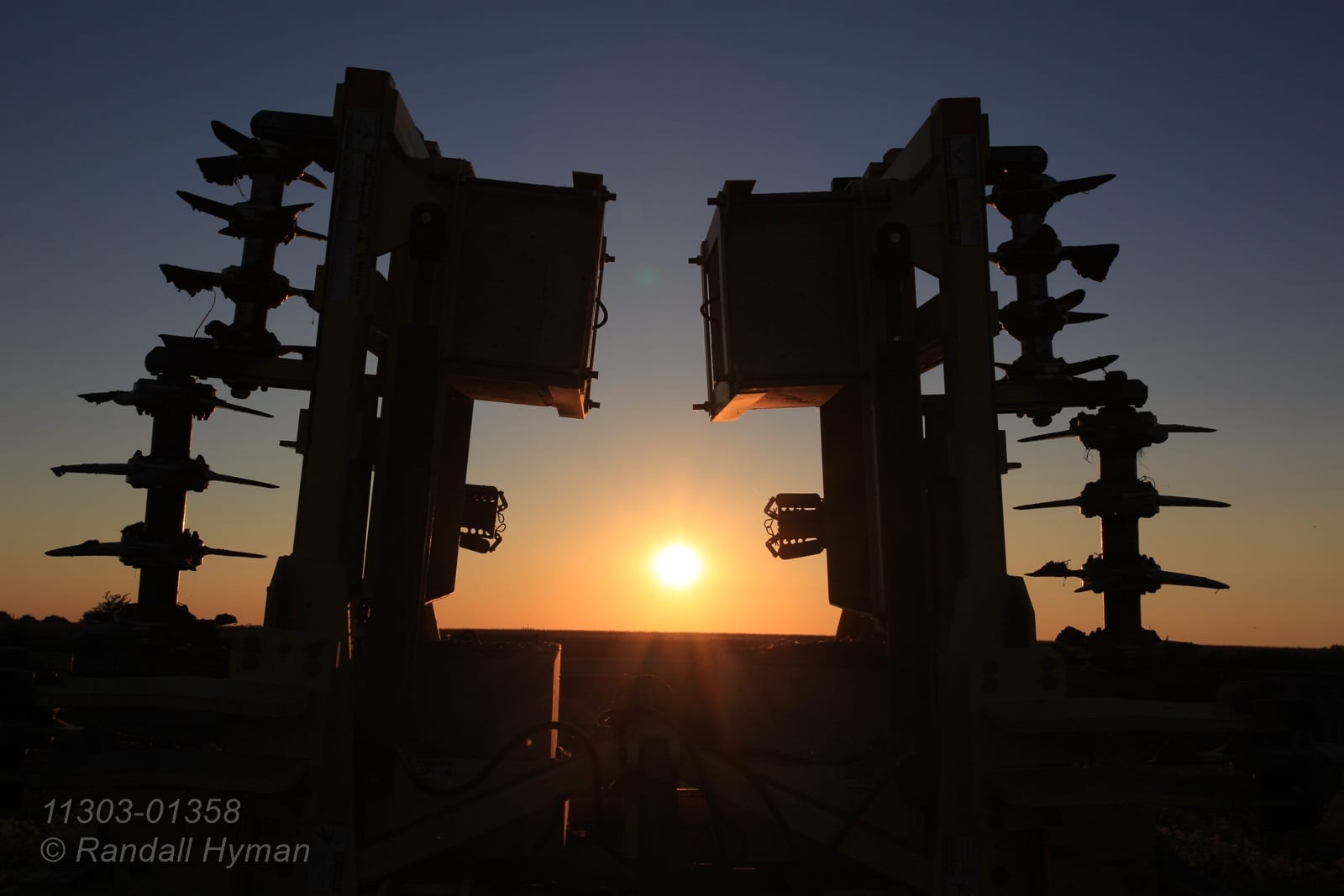 - Sunset silhouettes tiller implement on Corzatt farm near Berwick, Illinois.