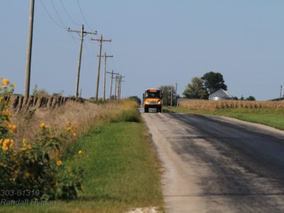 - Yellow school bus approaches Corzatt farm near Berwick, Illinois.