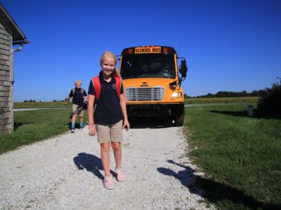 - Mallory Corzatt (9) and brother Logan (12) arrive home on yellow school bus at family farm near Berwick, Illinois.