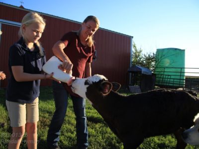 - Mallory Corzatt (age 9) and her mother Robin bottle feed young calf at family farm near Berwick, Illinois.