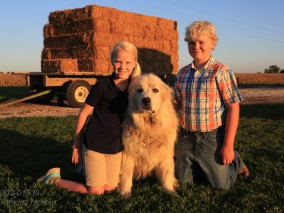 - Mallory Corzatt (9) and brother Logan (12) pose near hay wagon with dog Boomer, a Pyrenean shepherd; Berwick, Illinois.