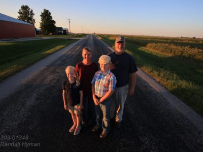 - Corzatt family poses on empty road at sunset (parents Brad and Robin, children Logan and Mallory) on their farm where they raise cattle, soybeans, corn and show sheep; Berwick, Illinois.