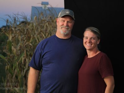 - Farm couple Brad and Robin Corzatt pose in cornfield near Berwick, Illinois.