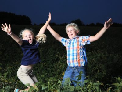 After dinner, the Corzatts show me around the barns and nearby fields. The sun is setting, and, while I photograph their parents in the soybean field across the road, the kids jump amid the bean plants like popcorn, full of youthful energy and play. It’s getting late, though, and soon time for bed.