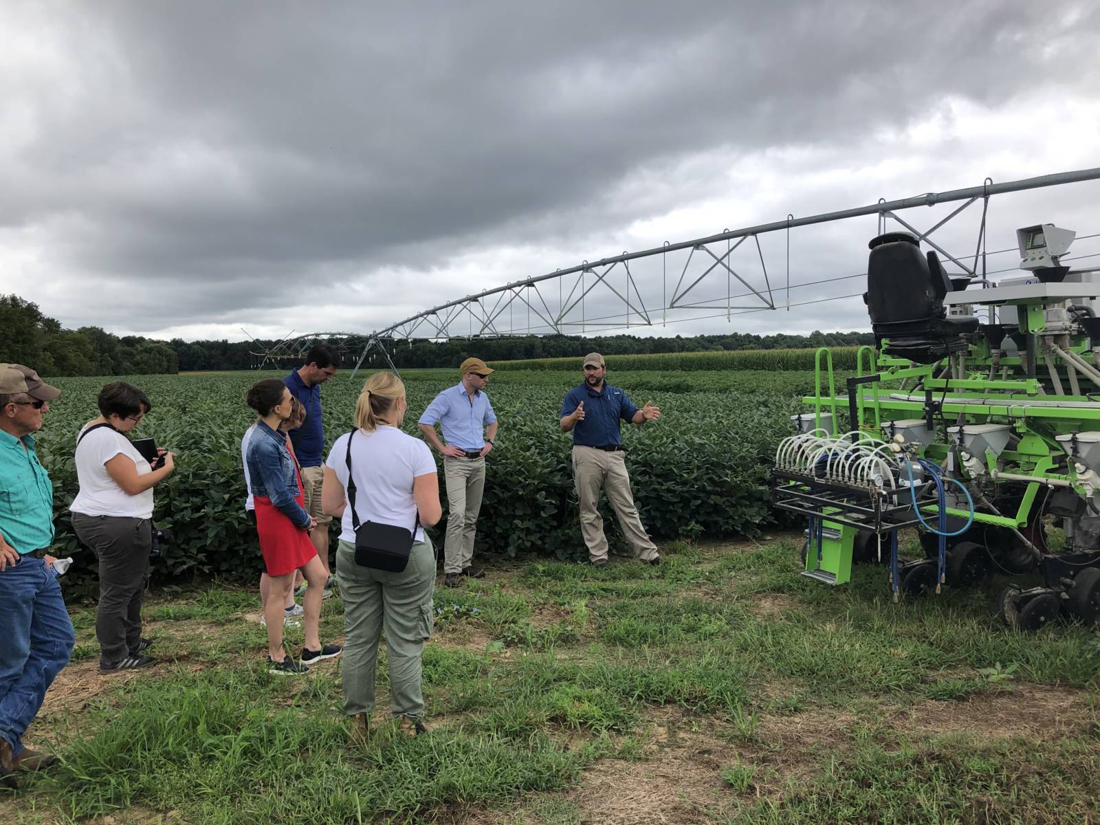 The day of farm visits organized by NRCS started with a stop at the Griggs Farms in Humboldt, Tennessee, where Matt and Kelly Griggs warmly welcomed the group to their fifth generation Tennessee Century Farm. Over the last twenty years, the Griggs have transformed their operation from monocrop production with conventional tillage to a strict crop rotation, no-till, and cover crop production method. The Griggs’ commitment to improving soil health and sustainable farming practices made a strong first impression on the European guests.
