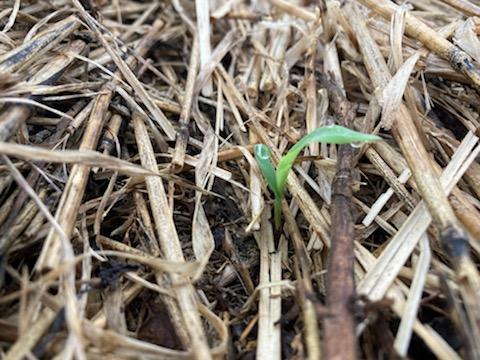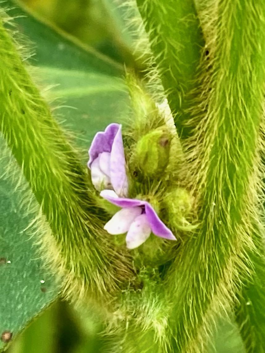The single-crop soybeans just started blooming. We have been scouting for weed problems since they were planted. Fortunately, the herbicide applied right at planting, combined with the residue left in the field from our no-till system, have kept these soybeans relatively weed-free. We did make a second herbicide application around the edges of the field to clean up weeds there, but we only applied it where it was needed.