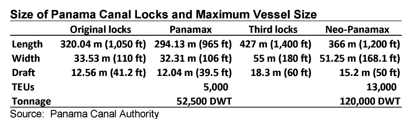 A Panamax vessel is the largest vessel that can traverse the old locks and a Neopanamax vessel is the largest vessel that can traverse the new locks. Note that there is no classification for a Neopanamax vessel in the following table. Approximately 30 vessels were built by grain merchants to take advantage of the new locks and can be loaded to 97,000 metric tons. With current ocean freight market conditions, incentive for building new bulk grain vessels is limited. The result is confusing terminology. Small Capesize, Large Panamax, Post Panamax and Neopanamax can be the same vessel. The new locks have increased the worth of Small Capesize vessels that can transverse the new locks.