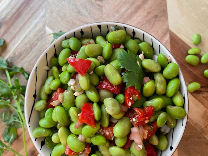 - In a large bowl toss together edamame, red peppers, shallot, cheese, and cilantro. Drizzle with dressing and toss to coat. Enjoy with whole grain pita chips or carrot chips, or spoon onto grilled fish or chicken breast.