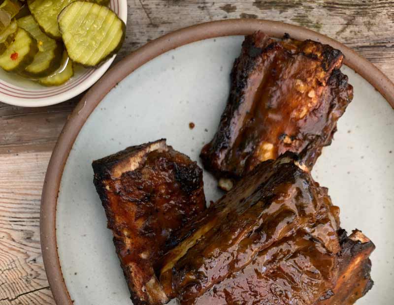 Build your barbeque platter! Line a baking sheet with brown paper. Pile on your ribs. Add any additional grilled items or condiments to the tray, like pickled red onion, Texas toast, bread & butter pickles, etc.