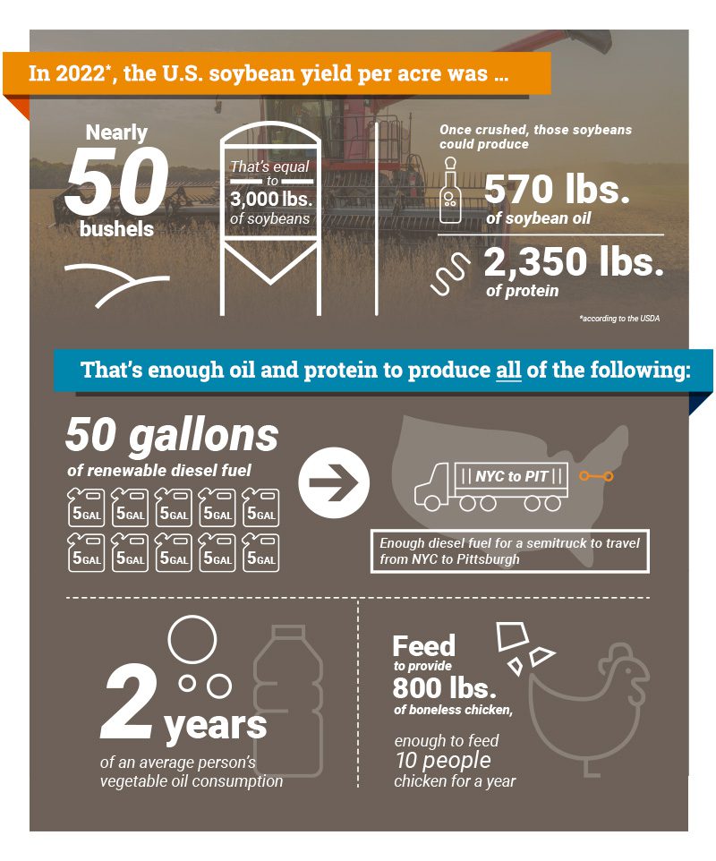 - We’re growing more soy every year. Over the past 40 years, U.S. soybean production has more than doubled with fewer acres available for farmland. U.S. soybean yields are predicted to continue growing by more than half a bushel per acre per year. That half a bushel per acre is roughly the equivalent of 30 pounds of soybeans, which provides almost 24 pounds of meal and almost six pounds of oil.