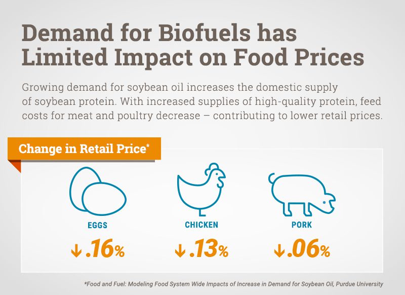 Recent research from Purdue University tells us increased use of soybean oil for biomass-based diesel has almost no net impact on food price inflation. The availability of more soybean protein leads to lower prices for animal diets – contributing to lower prices for consumers on eggs, chicken and pork. This adds significantly to the affordability and accessibility of these protein sources for consumers.