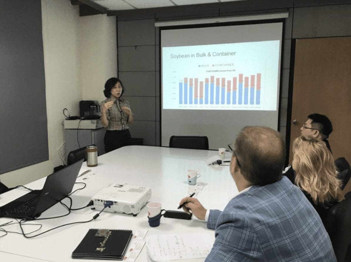- Ms. Jarnie Hsin, Senior Assistant Vice President of Commodities Trading Dept. of Great Wall Enterprises Co., Ltd. presents Taiwan soy market updates to the visiting U.S. soy industry representatives.